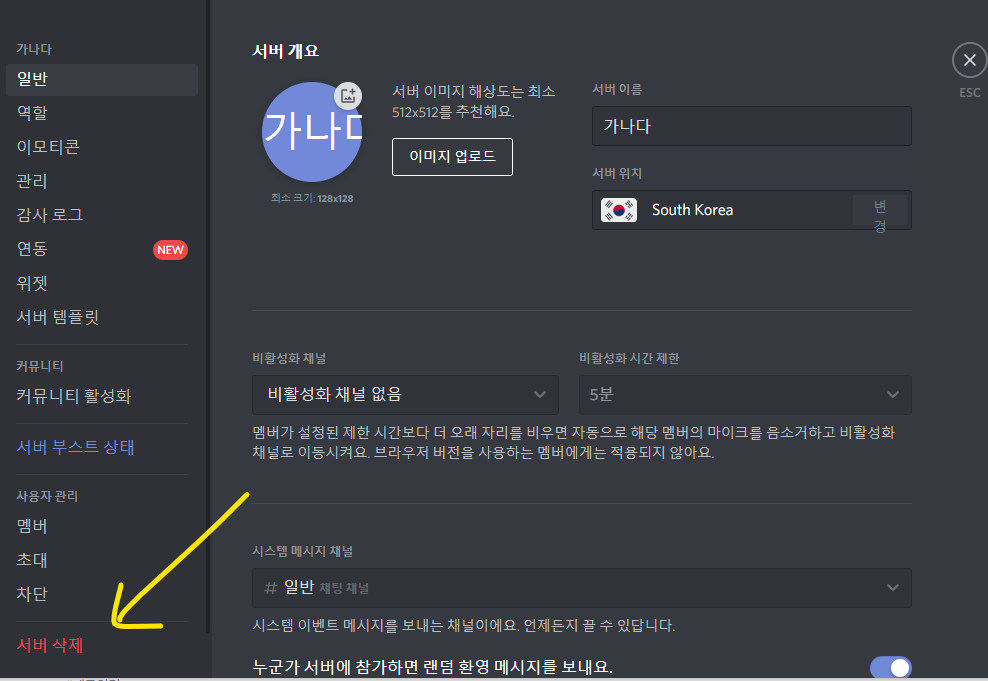 왼쪽 하단에 빨간색 글씨로 보이는 ' 서버 삭제'를 눌러주세요.