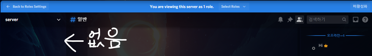 그리고 상단에 "You are viewing this server as 1 role."이라는 파란색 박스안에 문구가 생긴것을 볼수있습니다.
