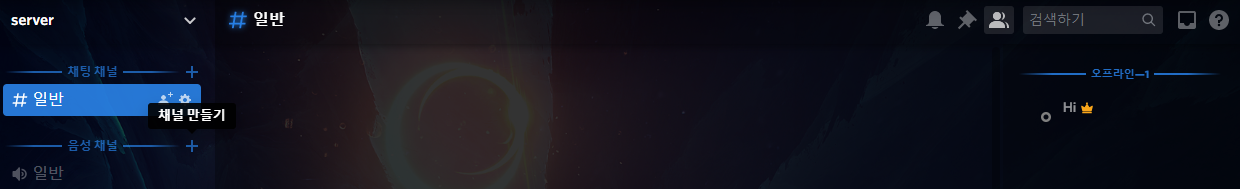 다음과 같이 채팅 채널이 1개가 있고 음성 채널이 1개가 있는 서버가 있습니다.