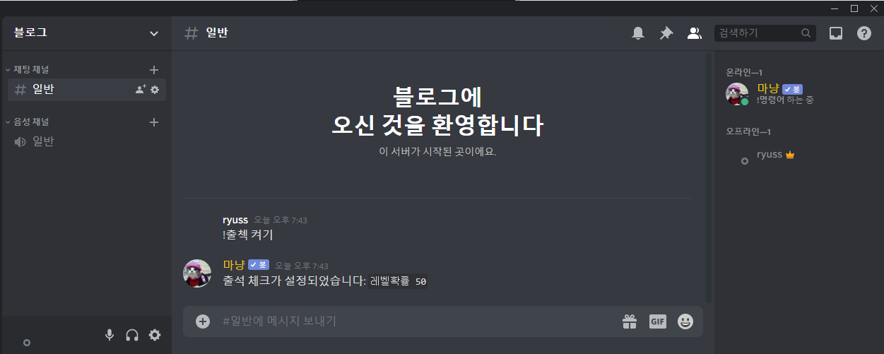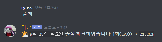 위 명령어를 입력했다면 이제부터 디스코드에서 출석체크를 할수 있습니다.