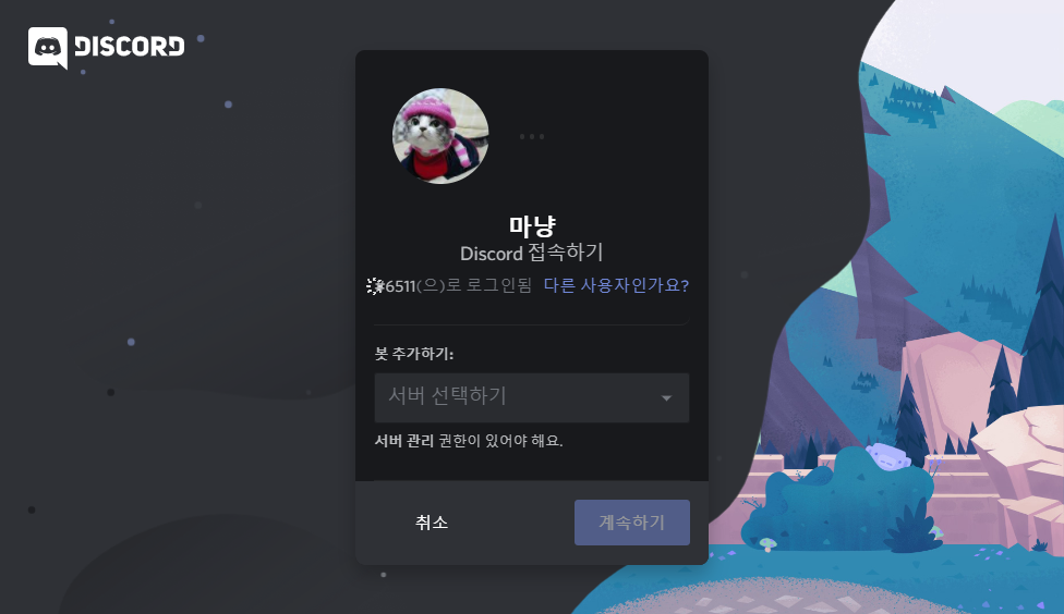 관리권한이 있고 초대할 서버를 선택한다음 하단에 있는 " 계속하기 "버튼을 눌러주세요.