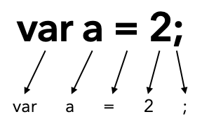 위 사진처럼 'var a = 2;'라는 프로그램을 토큰으로 나누게 된다면 다음과 같이 나뉘게 된다.