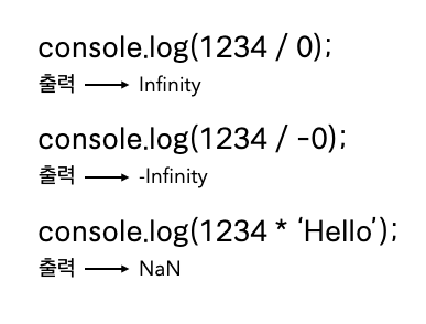 또한 Infinity(양의 무한대), -Infinity(음의 무한대), NaN(산술 연산 불가 / Not-a-Number ) 이 3가지 값 또한 있다.