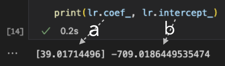 다음과 같이 LinearRegression 클래스가 찾은 a, b값은 lr객체의 coef_, intercept_를 통해 확인할 수 있다.