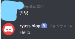 토큰을 넣어준뒤 실행후 채널에서 ' 안녕 ' 이라는 단어를 입력해 전송하게되면 봇이 ' Hello ' 라는 단어를 보내게 됩니다.