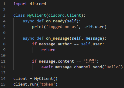 다음과 같이 입력해주신뒤 15번 줄에 token부분에 저번에 자신이 만든 디스코드 봇 토큰을 넣어주시면 됩니다.