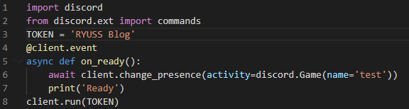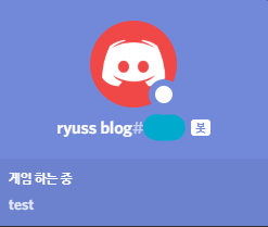 위 코드는 봇이 정상적으로 켜지게 되면 " test "라는 게임중 메시지를 띄우게 설정하고