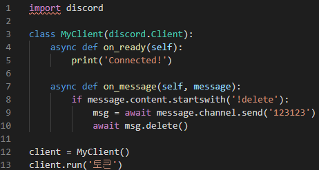 디스코드 봇이 " 123123 " 이라는 내용을 보내고 바로 그 메시지를 빠르게 삭제하는것을 볼수있다.