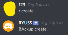 잘 작동하는 것을 볼 수 있다. 이제 백업 명령어를 제작할 것인데 백업을 시작하기 위해 나는 " create "라는 문구를 입력하면 봇이 백업을 하도록 제작할 예정이다.