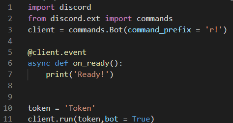 일단 시작하기 전에 prefix값을 정해주고 간단하게 봇의 형태를 잡아준다.